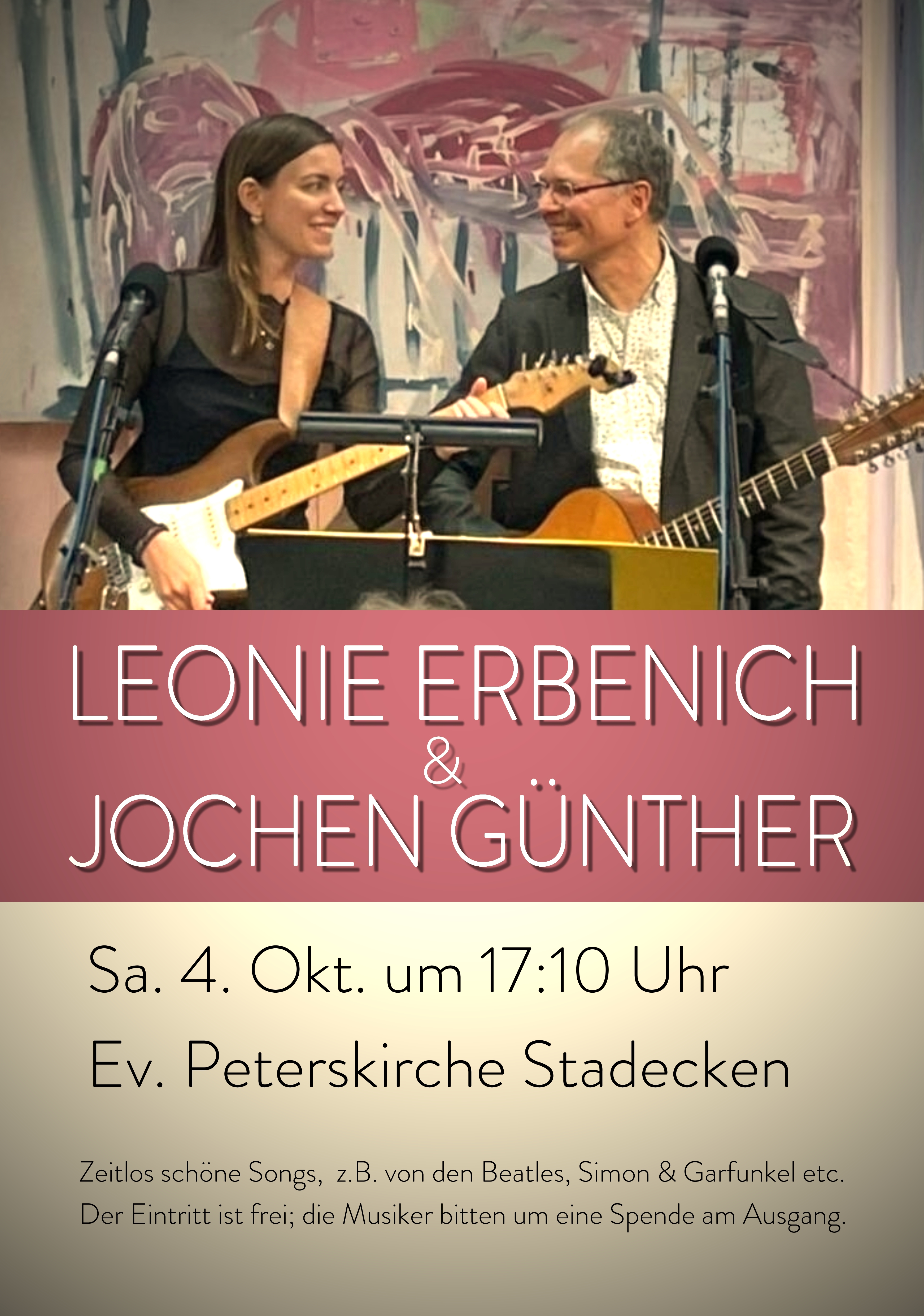 Am Samstag, den 4. Oktober, um 17.10 Uhr lädt die Ev. Kirchengemeinde Stadecken-Elsheim zu einem stimmungsvollen Konzert in die Peterskirche nach Stadecken ein: Leonie Erbenich und Jochen Günther spielen Gitarre und singen, sodass ein gelungenes Programm aus Oldies, Popsongs und Singer- Songwriterstücken, liebevoll ausgewählt und interpretiert, den Alltag für einen Abend lang vergessen lässt.