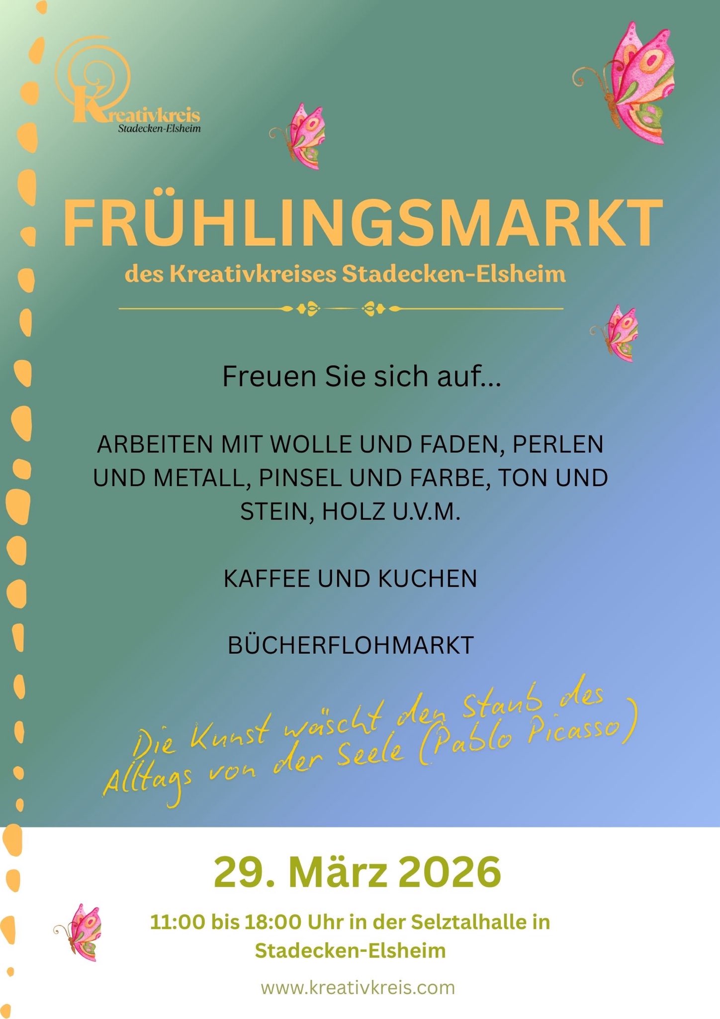 Der Frühlingsmarkt des Kreativkreises Stadecken-Elsheim findet dieses Jahr am 29.03. von 11:00 bis 18.00 in der Selztalhalle statt.